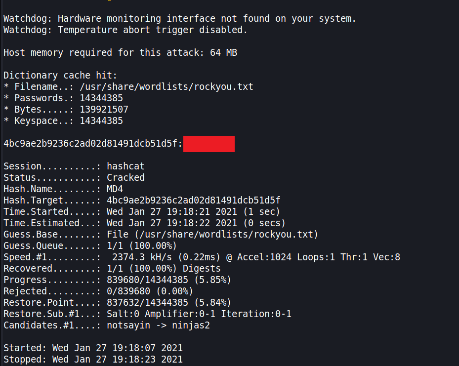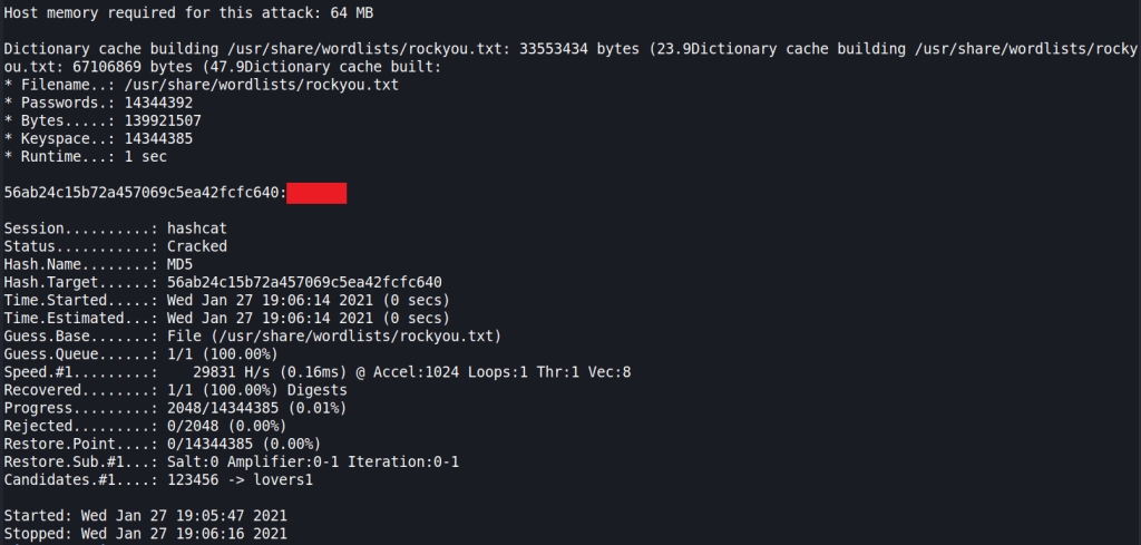 vincent@kali:~$hashcat -a 0 -m 900 md4.hash /usr/share/wordlists/rockyou.txt