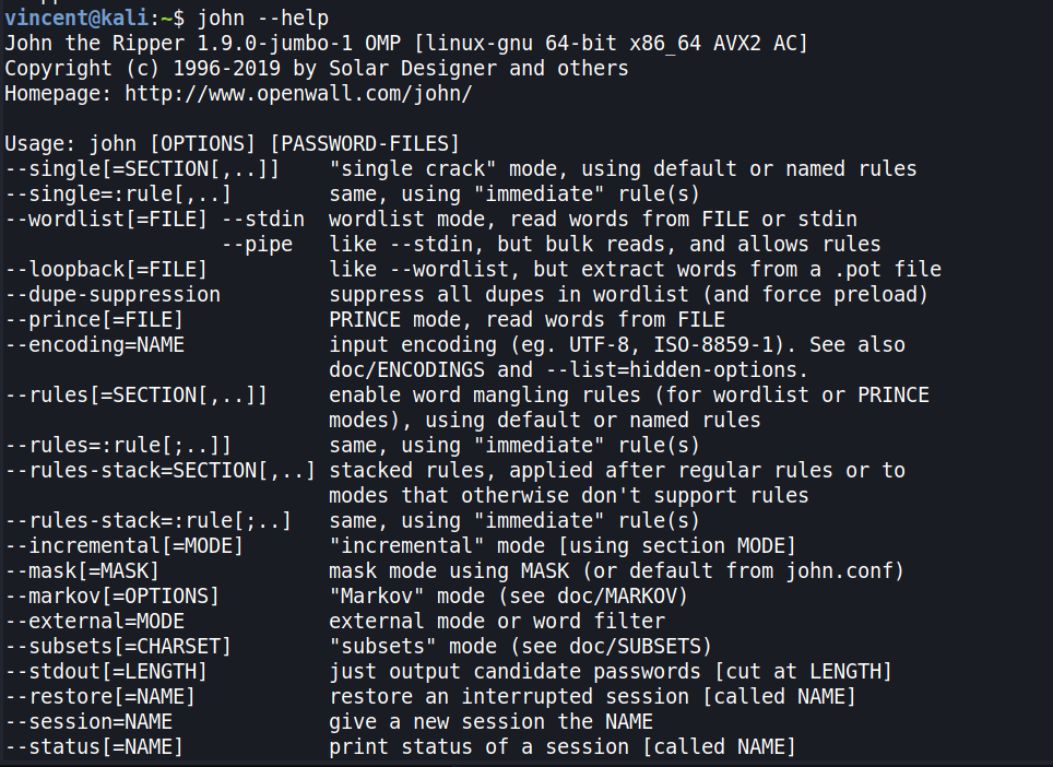 vincent@kali:~$ echo "56ab24c15b72a457069c5ea42fcfc640" >> md5.hash