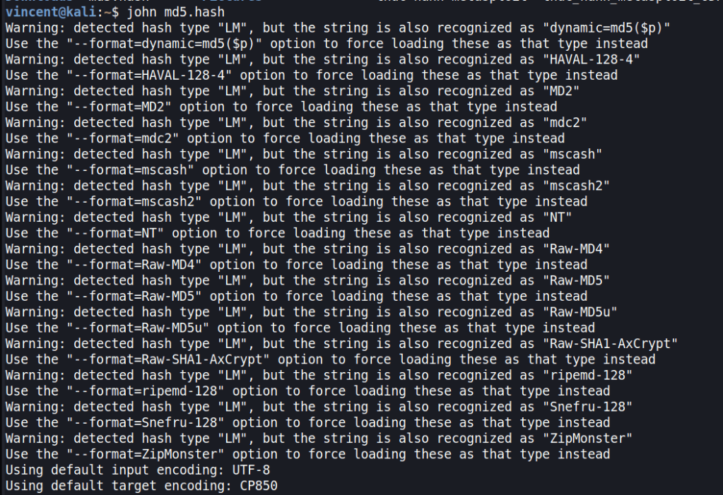 vincent@kali:~$ john --format=raw-md5 md5.hash
