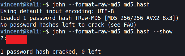 vincent@kali:~$ john --wordlist=/usr/share/wordlists/rockyou.txt --format=raw-md5 crack.hash --show