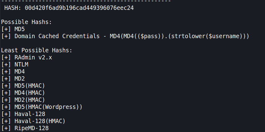 Như chúng ta thấy, với MD4 hash, Hash Identifier lại đặt tên thuật toán đúng ở phần Least Possible Hashs. Nguyên nhân là do một trong những yếu tố các phần mềm nhận biết thuật toán hash dùng để xác định đúng thuật toán hash chính là dựa vào độ dài của hash đầu vào.