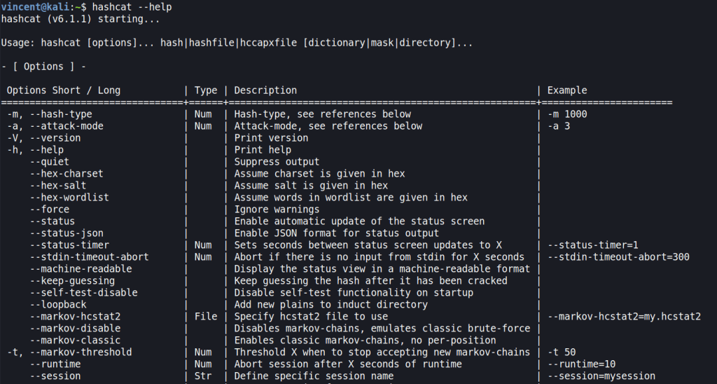 Trên giao diện dòng lệnh của Kali Linux, chúng ta gõ câu lệnh bên dưới để truy cập vào phần hướng dẫn sử dụng của Hashcat