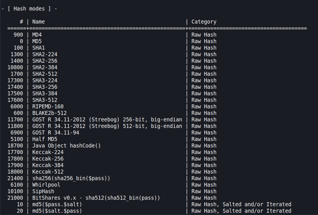 Như chúng ta thấy, Hashcat hỗ trợ rất nhiều thuật toán hash khác nhau đồng thời còn cho chúng ta biết phân loại của các thuật toán hash nữa.