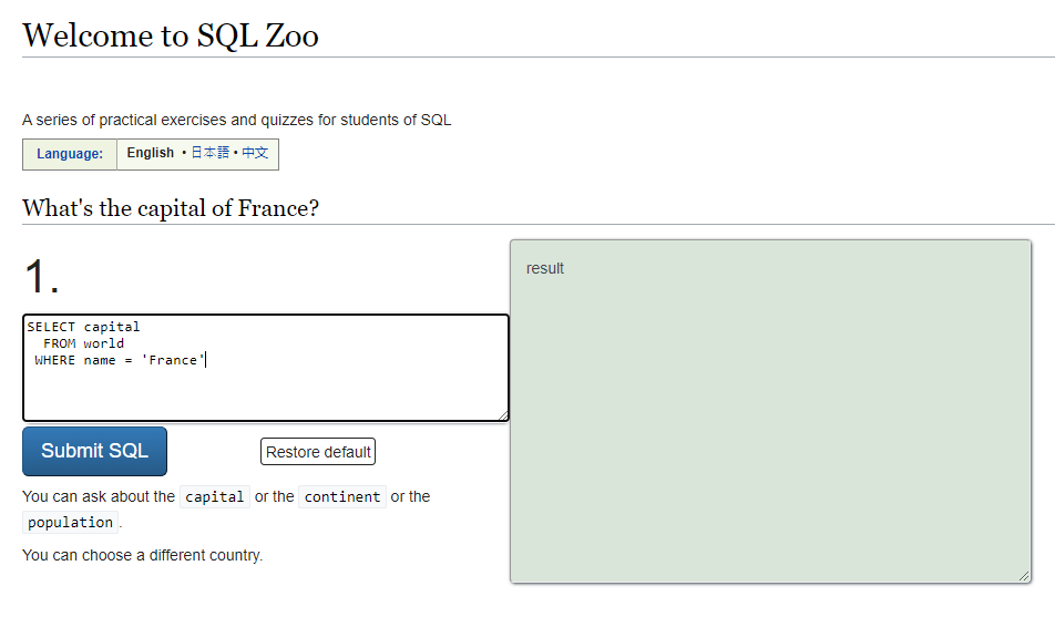 Ô màu trắng sẽ là nơi nhập dòng lệnh và ô màu xanh lá sẽ là nơi xuất kết quả. Sau khi nhập câu lệnh xong, các bạn cần bấm nút Submit SQL màu xanh dương để câu lệnh được chạy. Chúng ta sẽ cùng thực tập một vài ví dụ sau: