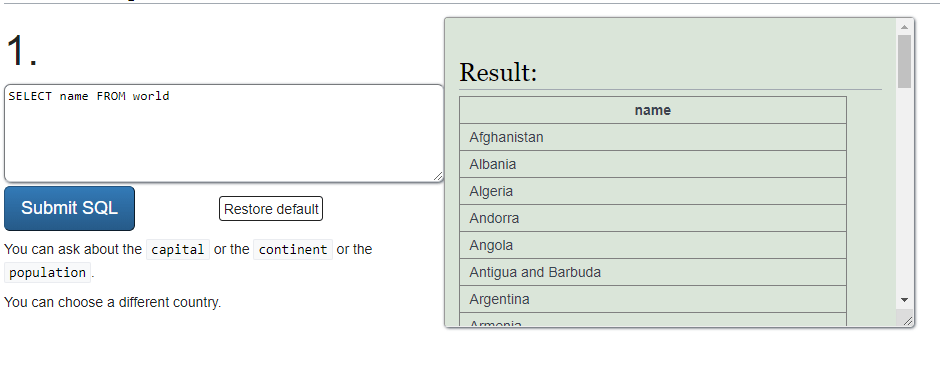 Câu lệnh trên có nghĩa là: Xuất toàn bộ dữ liệu lưu trong cột “name” của bảng dữ liệu “world”.