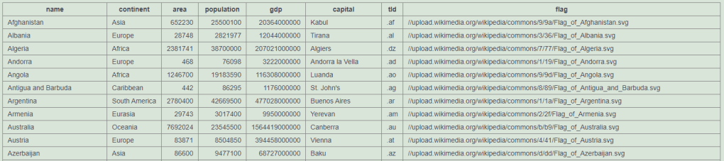 Với mỗi hàng là thông tin của một quốc gia khác nhau.