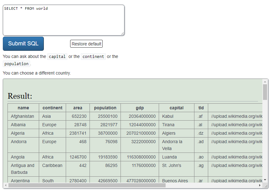 Có nghĩa là admin hệ thống của SQL Zoo chỉ cho phép xem tối đa 50 dòng dữ liệu 1 lần truy xuất. Vì cơ sở dữ liệu thường chứa khá nhiều thông tin quan trọng, việc giới hạn số dòng dữ liệu xuất ra cùng lúc sẽ giúp tránh dữ liệu bị rò rỉ không cần thiết.