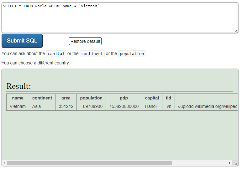 Câu lệnh trên có nghĩa là: Xuất ra toàn bộ dữ liệu được lưu trong các cột của bảng dữ liệu world với điều kiện giá trị ở cột name phải là ‘Vietnam’.