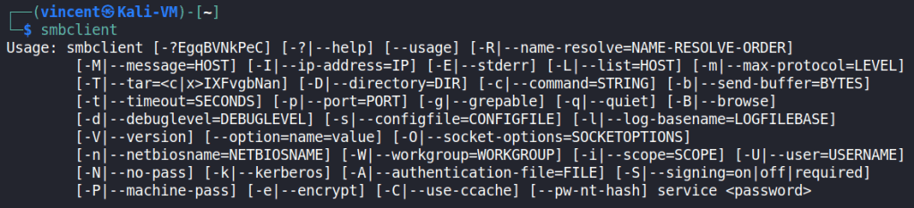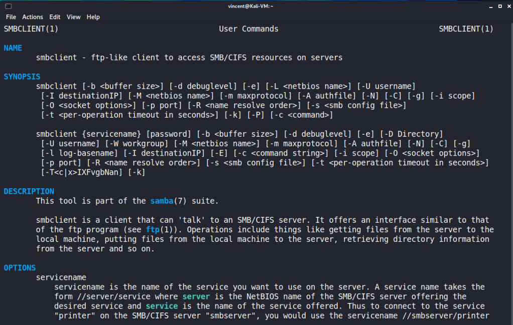 Để truy cập vào hướng dẫn sử dụng công cụ SMBclient, chúng ta sẽ sử dụng câu lệnh sau: