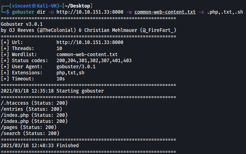 gobuster dir -u http://10.10.151.33:8000 -w common-web-content.txt -x .php,.txt,.sh