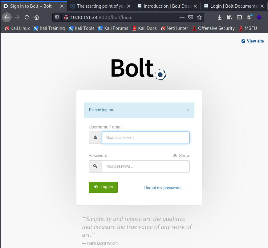Mình quyết định theo đường link The Bolt site trên Webservice để đi đến trang chủ của nền tảng CMS web Bolt. (Trang boltcms này không thuộc TryHackMe các bạn nhé).