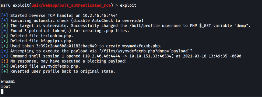 Và chúng ta đã tấn công thành công. Vì server Bolt chỉ có duy nhất account user root và không có người dùng với phân quyền thấp hơn, nên sau khi xâm nhập thành công, chúng ta mặc định có phân quyền của root luôn, do đó không cần phải leo thang đặc quyền nữa.