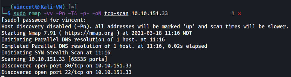 sudo nmap -vv -Pn -T4 -p- -oN tcp-scan 10.10.151.33