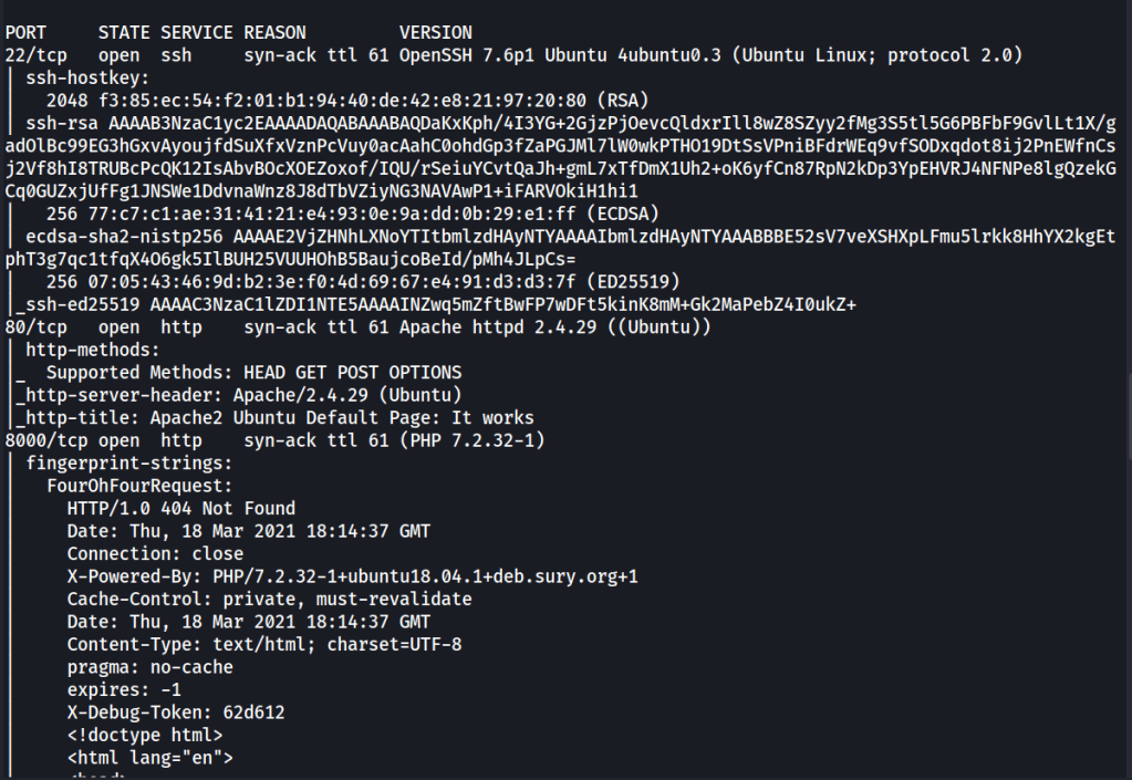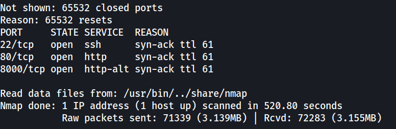Sau khoản 15 phút chạy, Nmap còn phát hiện thêm 1 ports nữa là port 8000, port 8000 này cũng chạy HTTP web service. Nên có thể kết luận server Bolt có 2 web services, một chạy ở port 80 và cái còn lại chạy ở port 8000.