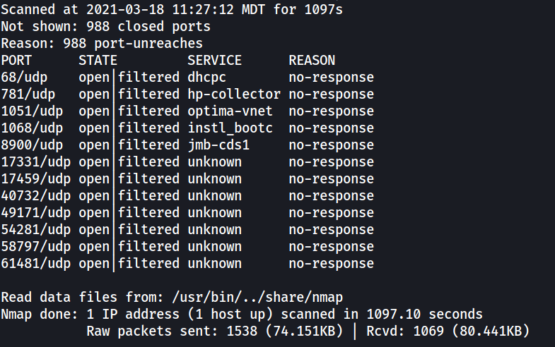 Có vẻ tất cả các port UDP đều đã bị tường lửa khóa. Chúng ta sẽ chuyển qua phần Nmap scan tiếp theo.