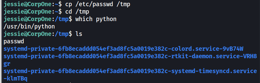 Và ta thấy được hệ thống Wgel có chạy Python, và đồng thời file /passwd đã được copy đến directory /tmp thành công.