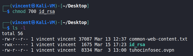 B3: Kiểm tra phân quyền và set lại phân quyền của file id_rsa là 700