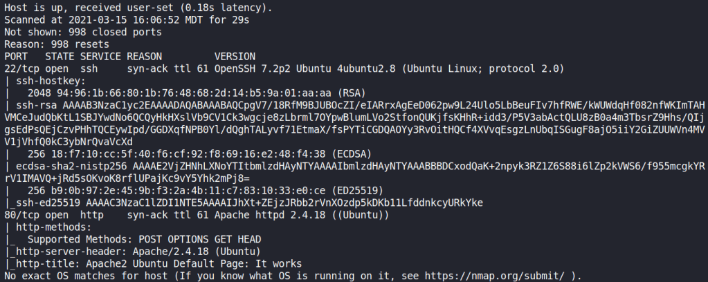 Nmap tìm ra 2 port 22 và 80 đang mở. Chúng ta có thể dự đoán:
