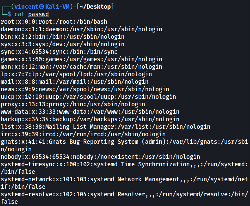 Chúng ta dùng lệnh cat để kiểm tra file passwd đã download và ta được kết quả như sau: