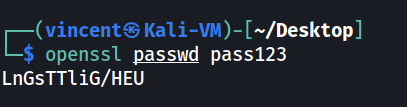 Chúng ta sẽ dùng công cụ openssl trên Kali Linux để tạo một password mã hóa có cùng thuật toán mã hóa với file /etc/passwd như bên dưới, mình chọn password là pass123 nhé: