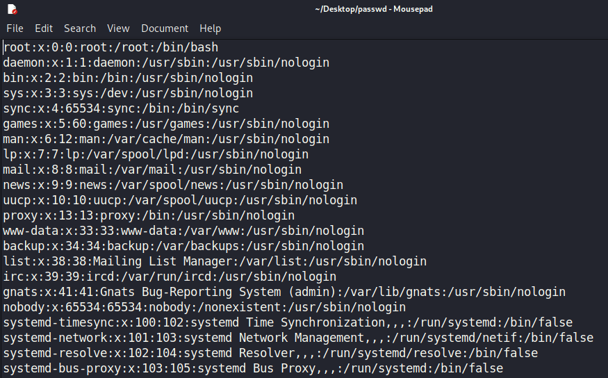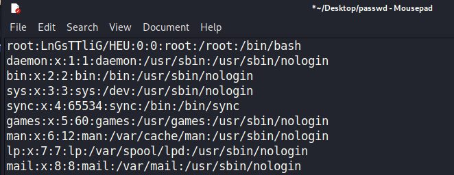 Mở file passwd bằng text editor trên Kali Linux